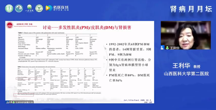 王利華教授首先全面細致的分享了一例疑難膜性腎病的病例。該患者為一退休男性,主因全身浮腫伴泡沫尿1月余,于今年10月入院。該患者在體檢中發現蛋白尿,入院化驗顯示:尿常規檢測為蛋白2+,尿潛血2+,24小時尿蛋白2.27g/d,血清白蛋白37.6g/L,腎功能未見異常。一個月后雙腿水腫,病情加重入院檢查尿蛋白3+,尿隱血3+,24小時尿蛋白7.3g/d,血清白蛋白12.7g/L,血肌酐也出現異常,伴有糖尿病。該患者入院后生命體征正常,具有顏面浮腫、雙下肢中重度對稱可凹形水腫等陽性體征。同時,該患者也進行了輔助檢查包括補體、抗核抗體、血沉、甲功、腫標、彩超等。ANA強陽性,抗SmD1抗體陽性、抗U1-snRNP抗體陽性、血清補體C3降低,為明確診斷,對該患者進行了腎活檢,通過腎臟病理診斷出該患者為非典型MN,建議完善相關檢查,尋找繼發原因,足細胞有損傷,疑似腎小球微小病變,另外患者存在明顯的急性腎小管損傷。結合病理及臨床癥狀,給予相應的治療方案,目前診斷為腎病綜合征(不典型膜性腎病、系統性紅斑狼瘡性腎炎)、足細胞病是否為腎小球微小病變還有待討論,以及急性腎損傷、肺部感染(敗血癥)、結締組織?。ㄏ到y性紅斑狼瘡、特發性炎癥性肌病、可能為多發性肌炎)、藥物肝損傷以及2型糖尿病。針對該病例的治療,主要采用免疫抑制劑甲潑尼龍和地塞米松(因感染而中斷),另外間斷的輸白蛋白和依諾肝素的抗凝以及保肝治療。治療過程中目前存在的主要問題為治療效果不理想以及AKI持續不緩解,激素治療后肌酸激酶升高,同時該患者免疫抑制劑使用受限。最后王利華教授針對該病例的診斷和治療提出了更多有價值的思考,包括下一步的治療方案調整,足細胞病的解釋以及是否診斷為狼瘡性疾病還是合并多發性肌炎?