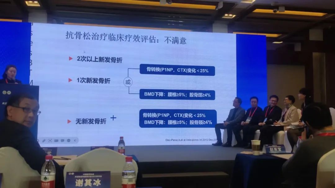 謝其冰教授還強(qiáng)調(diào)了在疾病診斷和治療過程中,至少選擇一個骨形成標(biāo)志物和一個骨吸收標(biāo)志物;疾病隨訪、療效監(jiān)測時應(yīng)檢測同樣的BTMs;目前國際上多推薦P1NP為首選骨形成標(biāo)志物,β-CTX為首選骨吸收標(biāo)志物。冬梅教授指出β-CTX治療中期望值為最少降低>35%,P1NP至少升高>40%;如果二者在治療監(jiān)測中變化程度<25%,則認(rèn)為抗骨質(zhì)疏松療效不滿意。