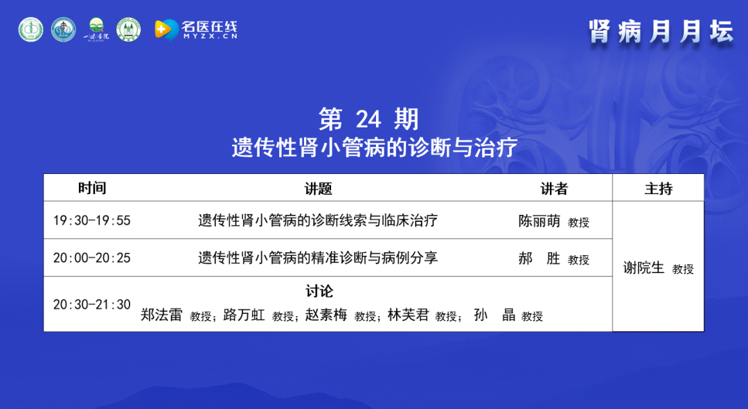 謝教授簡單介紹了“腎病月月壇”的歷史,“腎病月月壇”是在2022年5月開始舉辦的線上學(xué)術(shù)交流活動,迄今為止正好兩年時間,24個月共舉辦了24期,每月一期,每一期都是在每月第3周的周二晚上19:30-21:30開展,形式是講座與討論相結(jié)合。“腎病月月壇”最開始議題聚焦在膜性腎病,后來逐漸延展至多器官損害、新冠相關(guān)的多系統(tǒng)損害及風(fēng)濕性疾病的腎臟損害等,今年以遺傳性腎病為主,今天的主題是遺傳性腎小管病的診斷與治療,邀請了在該領(lǐng)域臨床及研究方面有很深造詣的專家進行交流。