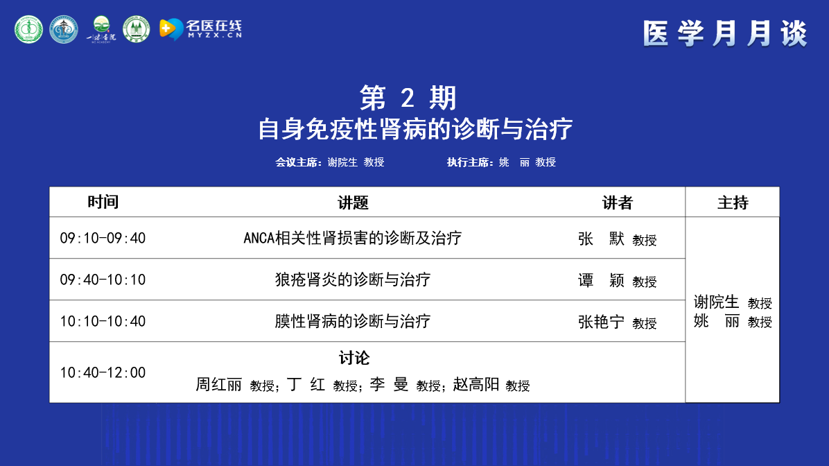 謝教授簡單介紹了“醫(yī)學月月談”的前身“腎病月月壇”的歷史,“腎病月月壇”是在疫情防控期間開展的線上學術交流活動,以腎臟病或系統性疾病腎損害的診治為主,每期一個主題,為了讓更多的人受益,升級為“醫(yī)學月月談”。“醫(yī)學月月談”以臨床需求為導向,以解決臨床問題為目的,具有以下特色和優(yōu)勢:①每月1-2次,一般在星期六上午;②線下和線上相結合,線下在全國主要城市輪流舉辦,線上直播,會后回放;③每期一個主題,設立專題執(zhí)行主席,與會議主席一起主持“醫(yī)學月月談”;④講座、病例分享與點評討論相結合;⑤多學科交叉融合,涉及腎內科、風濕免疫科、神經內科、檢驗科、皮膚科、呼吸科、腫瘤科等多學科的學術交流;⑥突出西醫(yī)和中醫(yī)相結合、臨床和檢驗/病理相結合、精準診斷和有效治療相結合,為醫(yī)患提供更全面的學術支持。