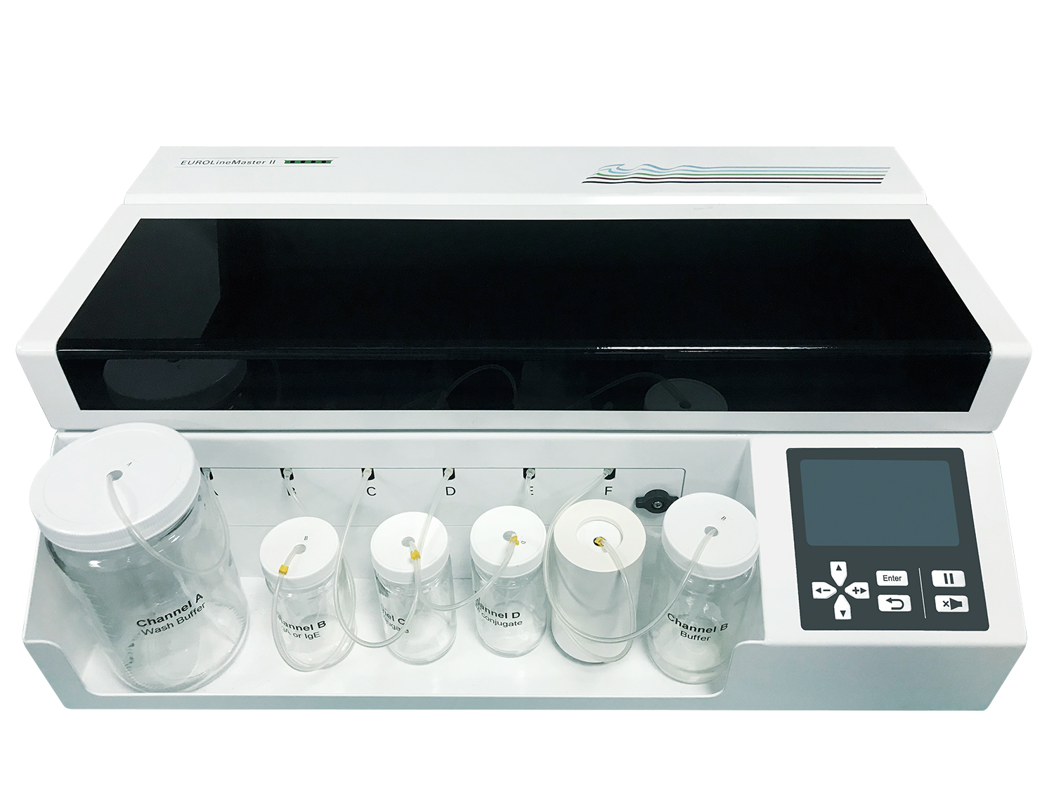EUROLineMaster Ⅱ是一款針對免疫印跡實驗的全自動操作儀器,設(shè)備執(zhí)行檢測項目所有的孵育和洗滌步驟,以及試劑的分配。通過配備相應(yīng)的判讀儀和判讀軟件(EUROLineScan)可進(jìn)行結(jié)果判讀,實現(xiàn)了免疫印跡實驗自動化、標(biāo)準(zhǔn)化檢測操作。適用于所有的歐蒙印跡膜條,在一臺設(shè)備上即可實現(xiàn)自身抗體、病原體抗體和過敏原檢測的組合。